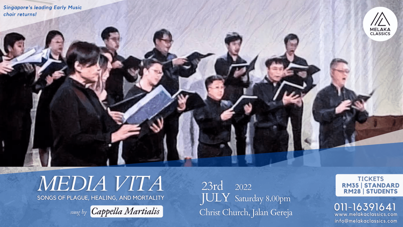 In this performance, Cappella Martialis – Singapore’s leading Early Music Choir – returns to Melaka after a 3 year absence to present hymns, motets, and pieces that were sung in times of great peril and public need. The choir will perform a cappella with original pronunciations of the Latin and English texts. For all classical music enthusiasts and historians, this performance is not to be missed!