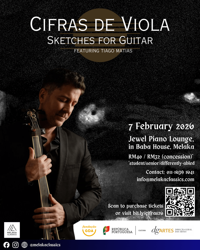 Portuguese guitarist Tiago Matias invites us to listen a little more closely — not only to music, but to history breathing through wood and string. Here in Melaka, a city where Portuguese heritage still lives in language, song, and memory, these sounds return like familiar footsteps. Originally from Aveiro, Portugal, guitarist and lutenist Tiago Matias completed the Advanced Course in Classical Guitar at the Aveiro Calouste Gulbenkian Conservatory in 2002 with the highest mark, and later earned his degree in Guitar from the Lisbon School of Music. A prize-winner at several international competitions — including 1st Prize at Música en Compostela (2004). He has since developed a distinguished career as both soloist and ensemble musician.