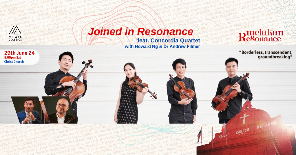 Making their Melakan debut, Concordia Quartet together with Howard Ng (oboe) and Dr Andrew Filmer (viola) will present a captivating program featuring the masterpieces of Mendelssohn, Mozart, and Dvorak. Bringing together musicians from Singapore and Kuala Lumpur, “Joined in ReSonance” is a concert bringing together friends from across borders; to resonate in Melaka.